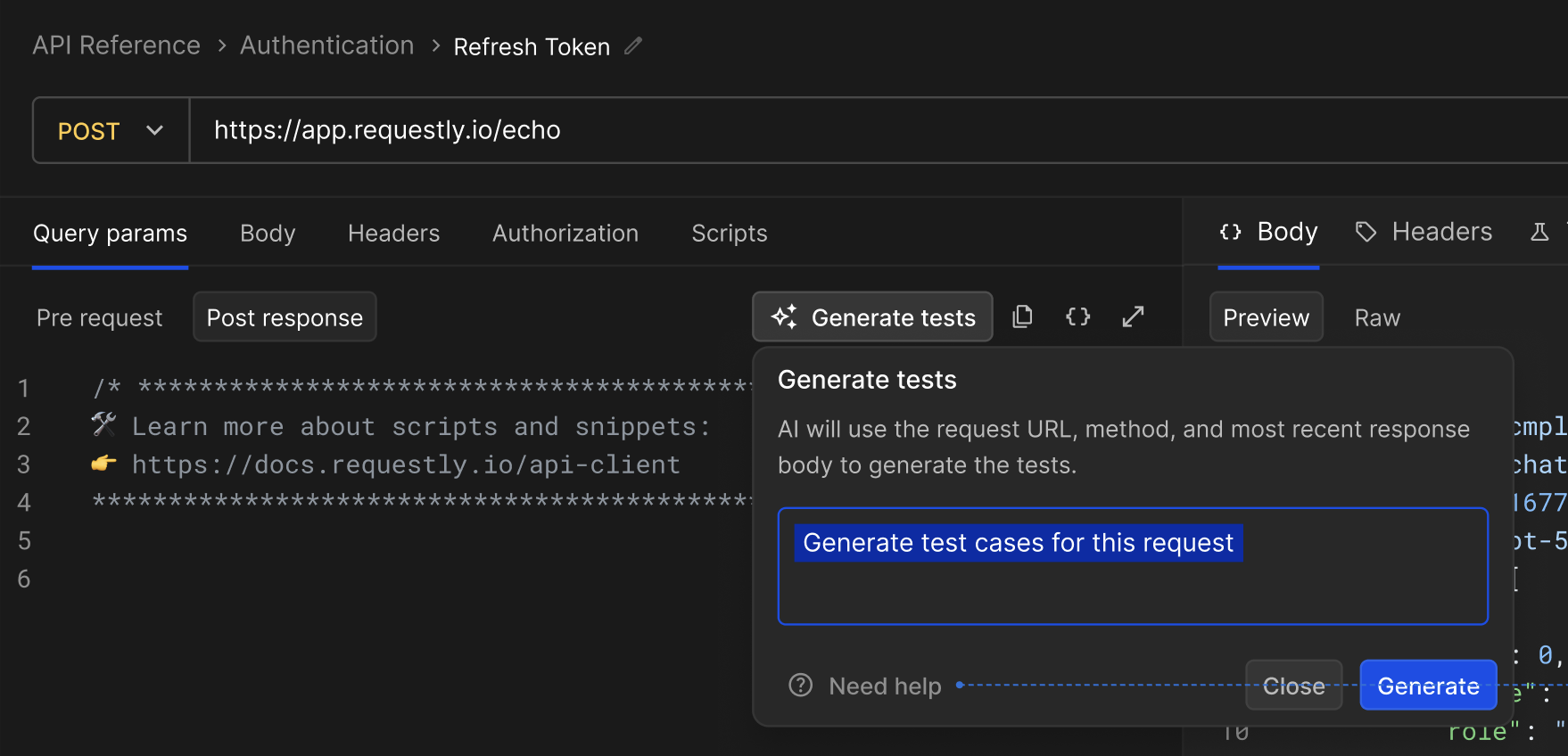 - AI Test Generator currently generates Post-response scripts only
