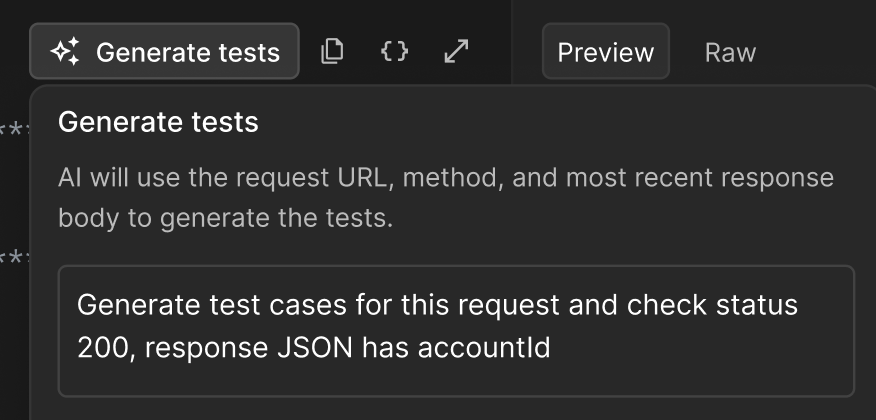 Instruction: “Validate the entire response structure against a schema” Generates schema validation tests that ensure the response conforms to the expected data structure.Tips for Better AI-Generated Tests