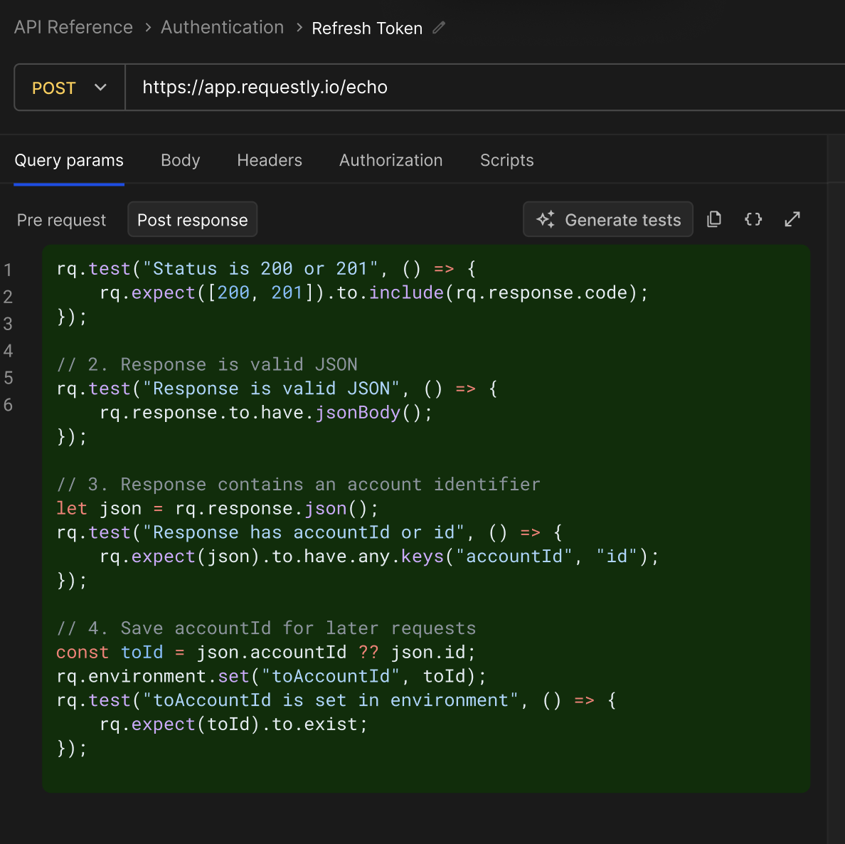You have three options after reviewing the generated tests: Click Accept to replace your full Post-response script with the generated tests. The new tests will be immediately available for execution. Click Edit Instruction to refine your original instruction and regenerate. This is useful if:- The generated tests are incomplete
