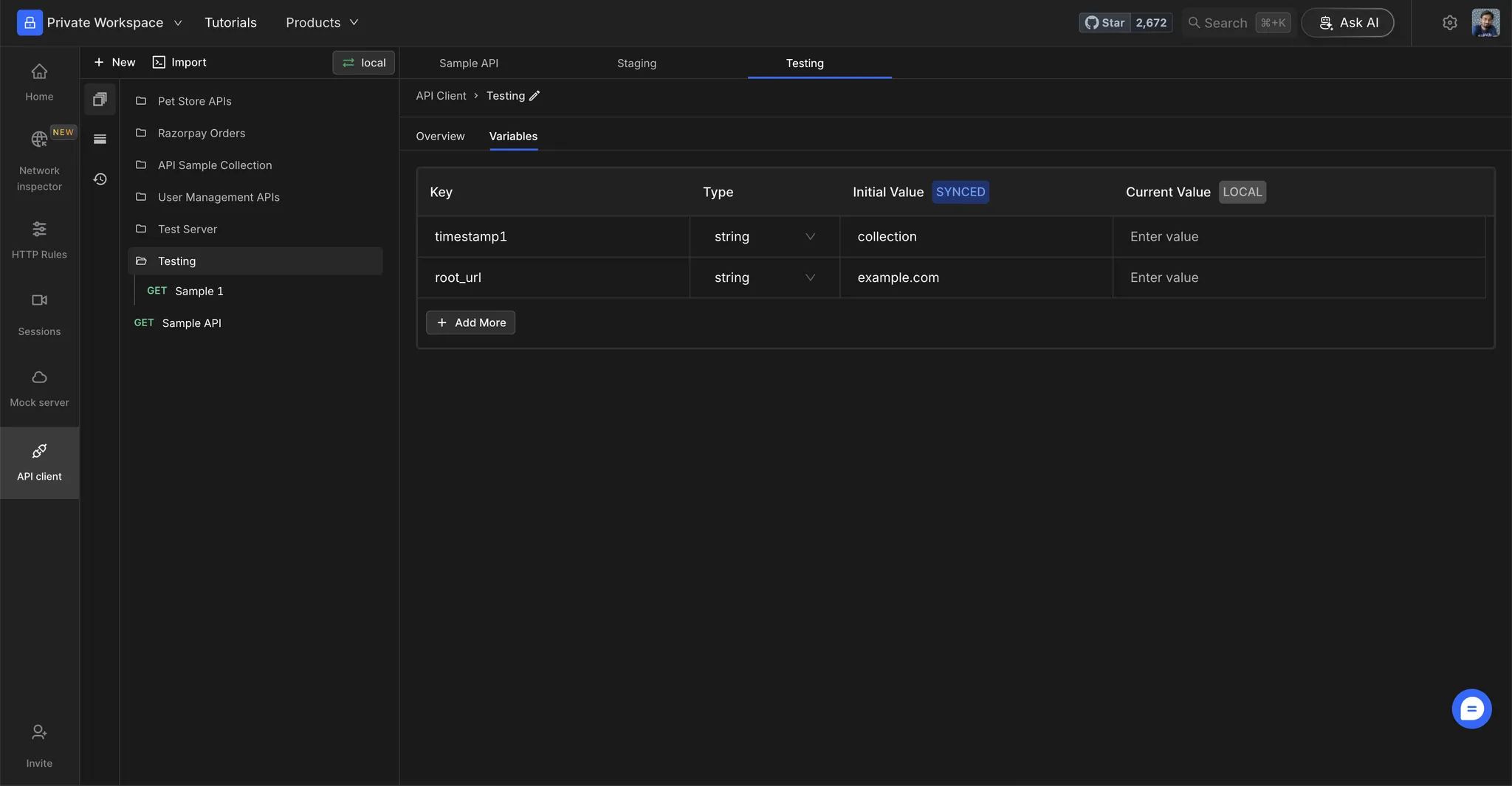 - Current value (local): Current values are user-defined entries that are not synced across the workspace. These values will override the defined Initial values. If the current value is empty or left blank, then the initial value of the variable will be used.