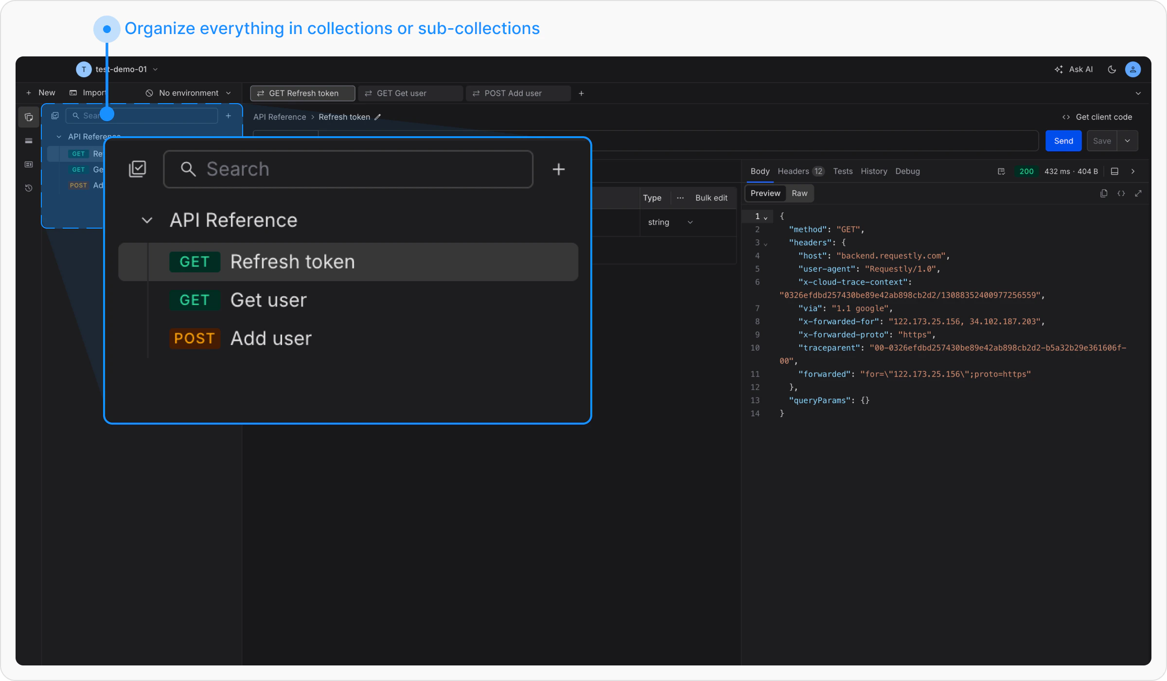 You can also create folders inside collections to group requests by feature or endpoint. Learn more about collections →