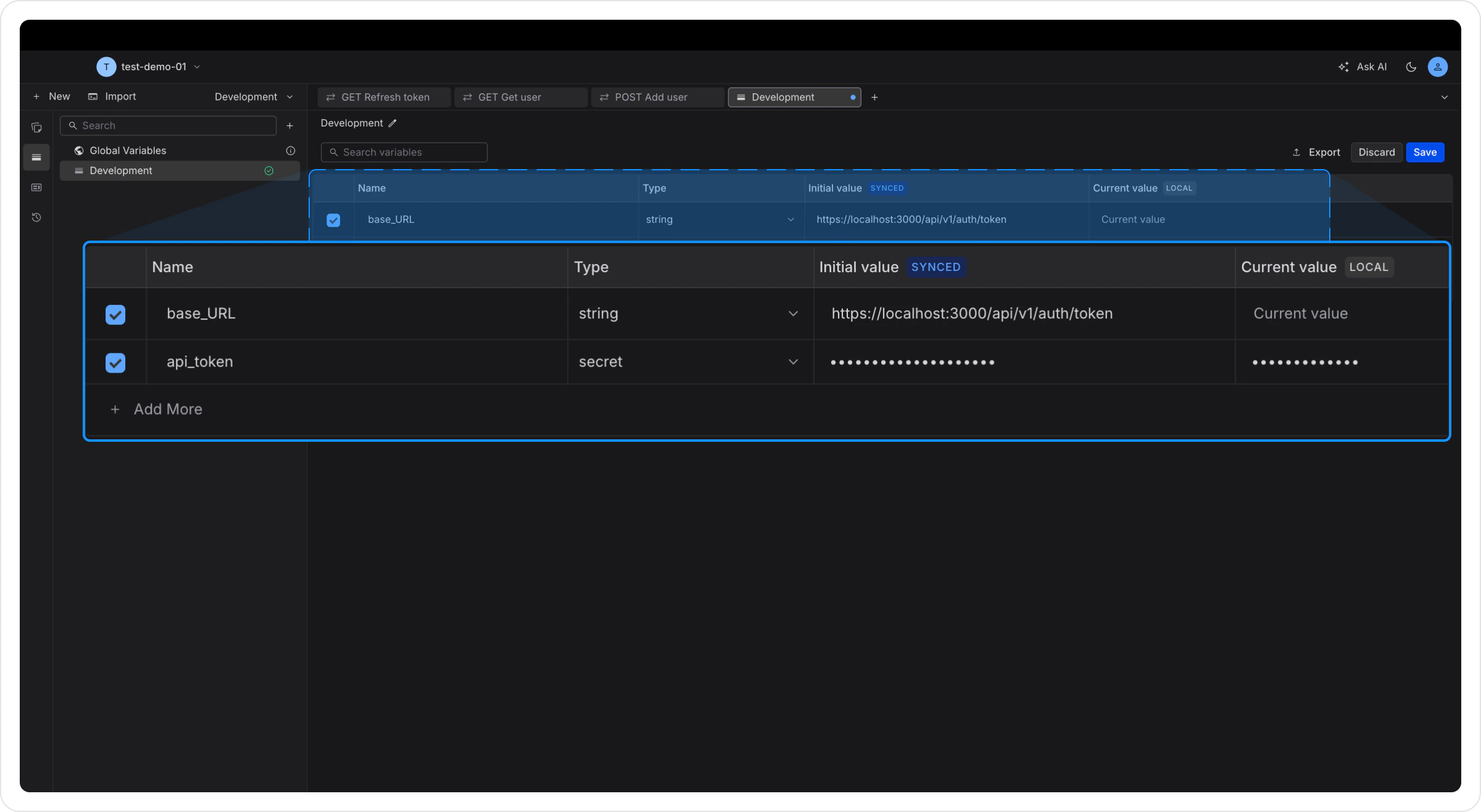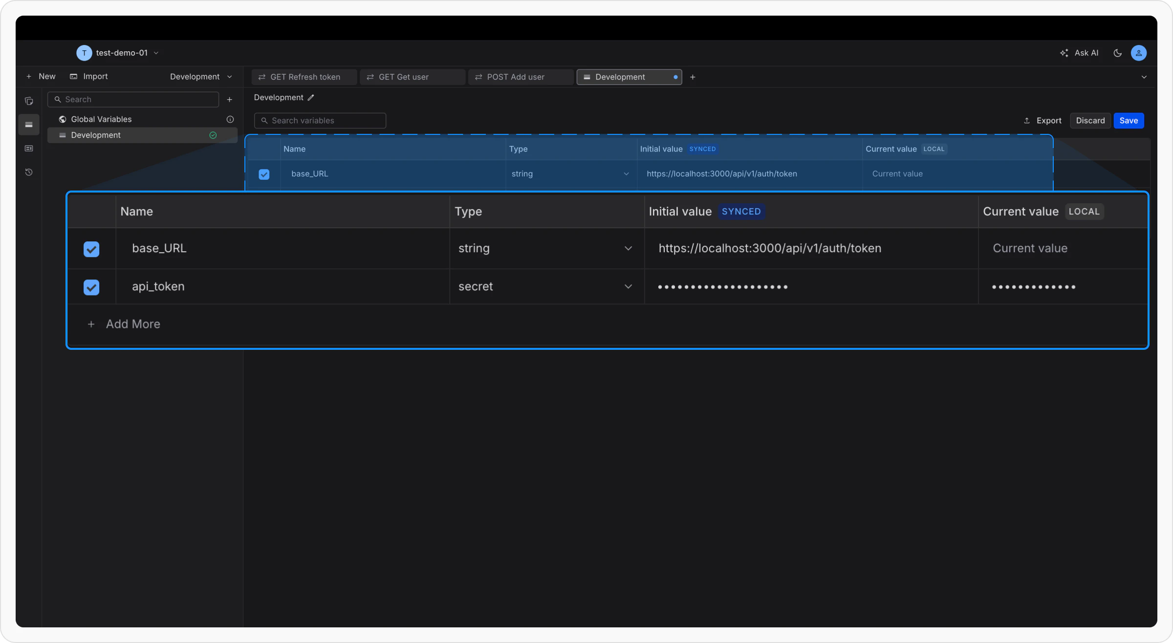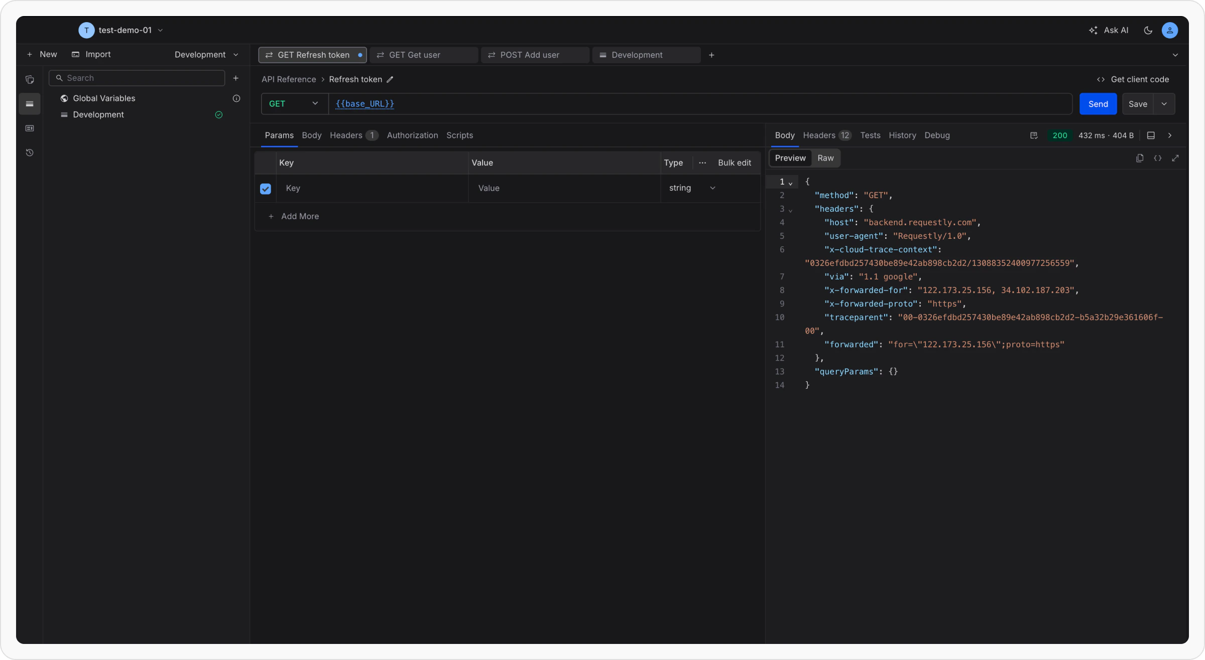 Production environment with a different base_url and switch between them using the environment dropdown. Learn more about variables →
