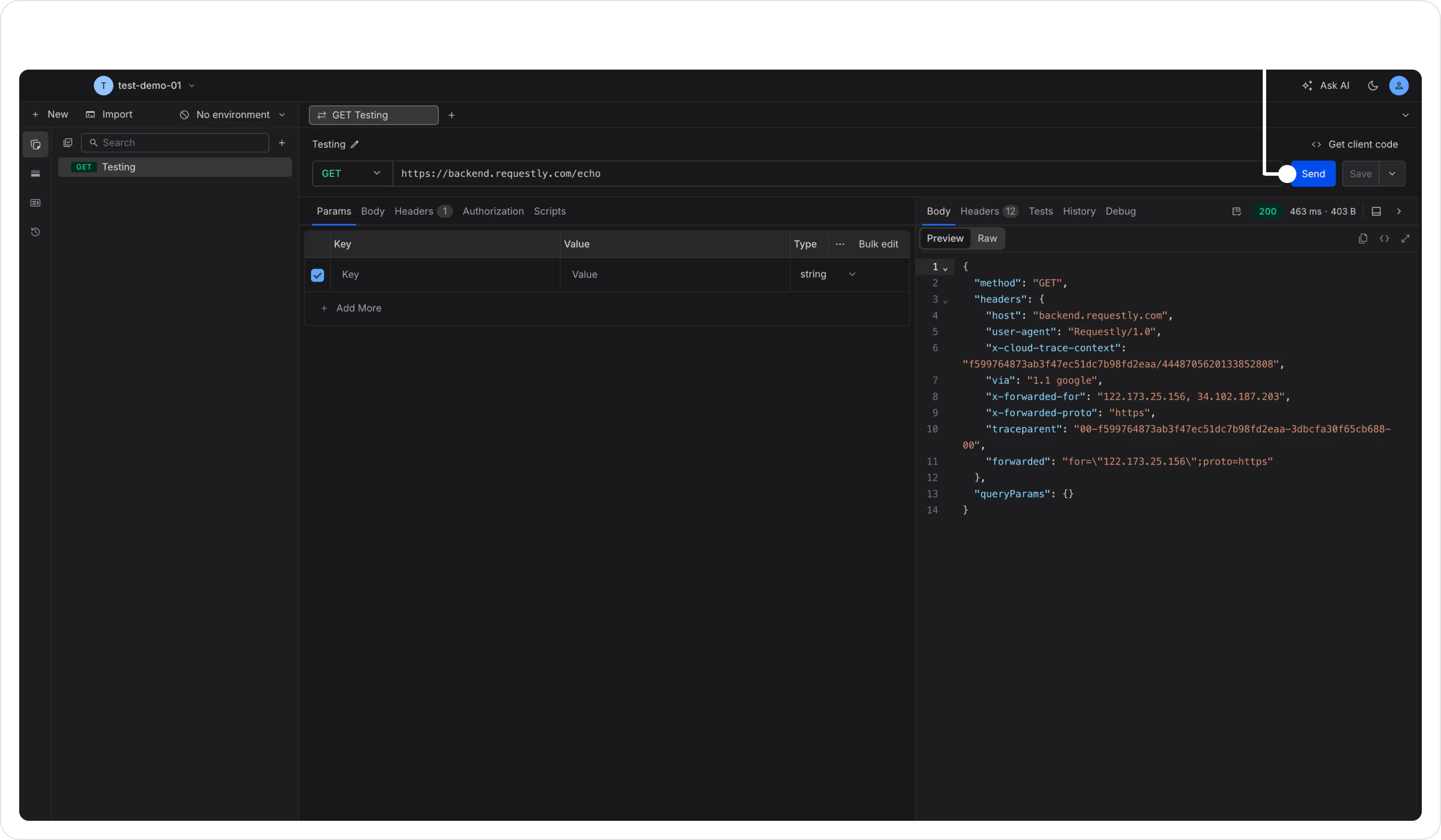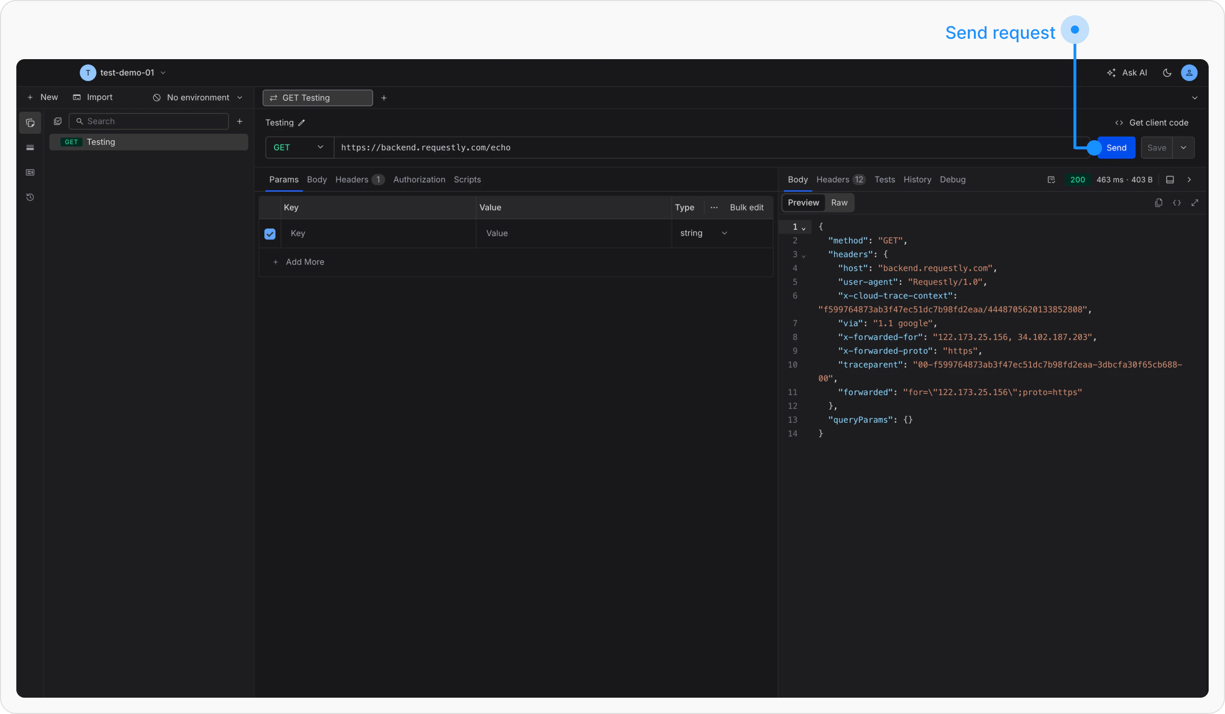 You’ve sent your first request. The response panel shows the body, headers, status code, and response time.