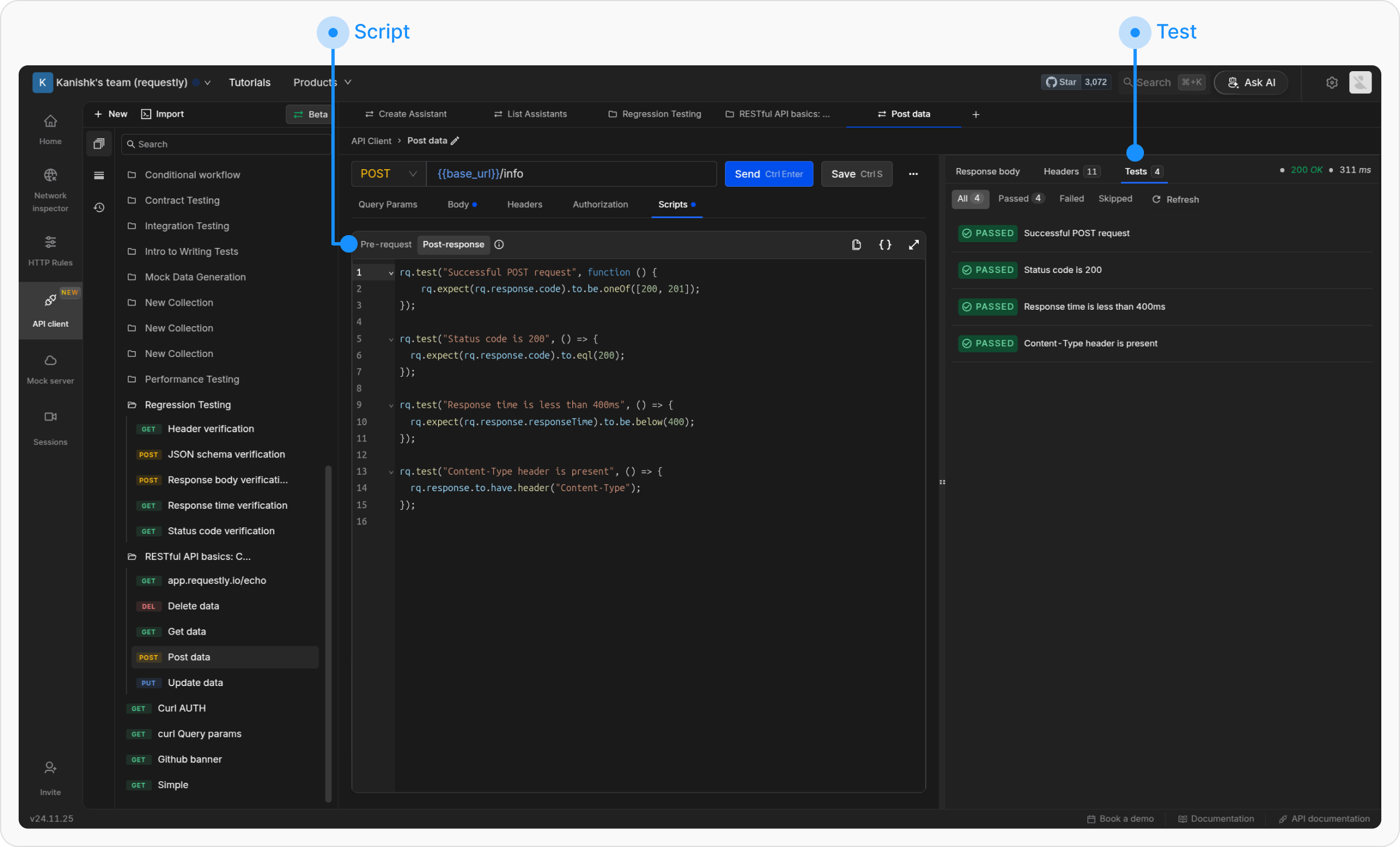 Automated API testing ensures endpoints function as expected. Requestly allows you to write tests using JavaScript with the