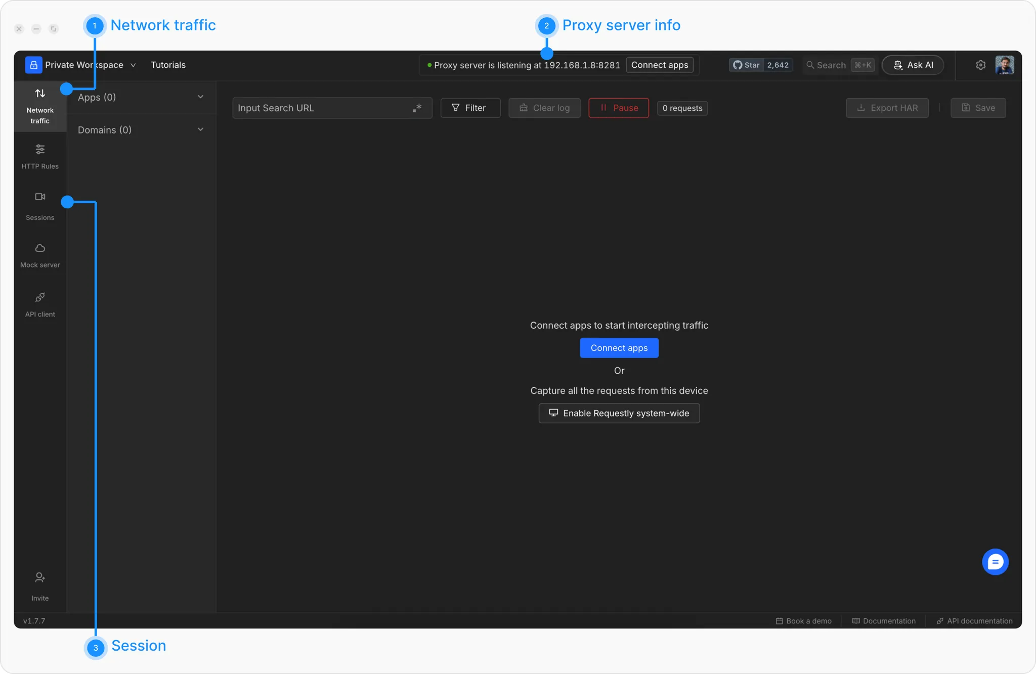 Proxy Server Indicator — The Proxy Server is listeningbar indicates that the proxy server is running on the Desktop App. It is used to intercept traffic from the various places mentioned above and display it in the Network Traffic table. Clicking theConnect appsbutton provides options to connect to browsers, desktop apps, mobile simulators, mobile apps, and more.