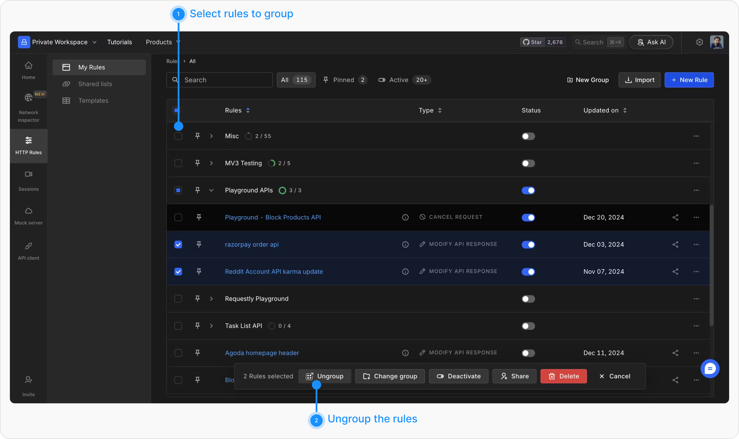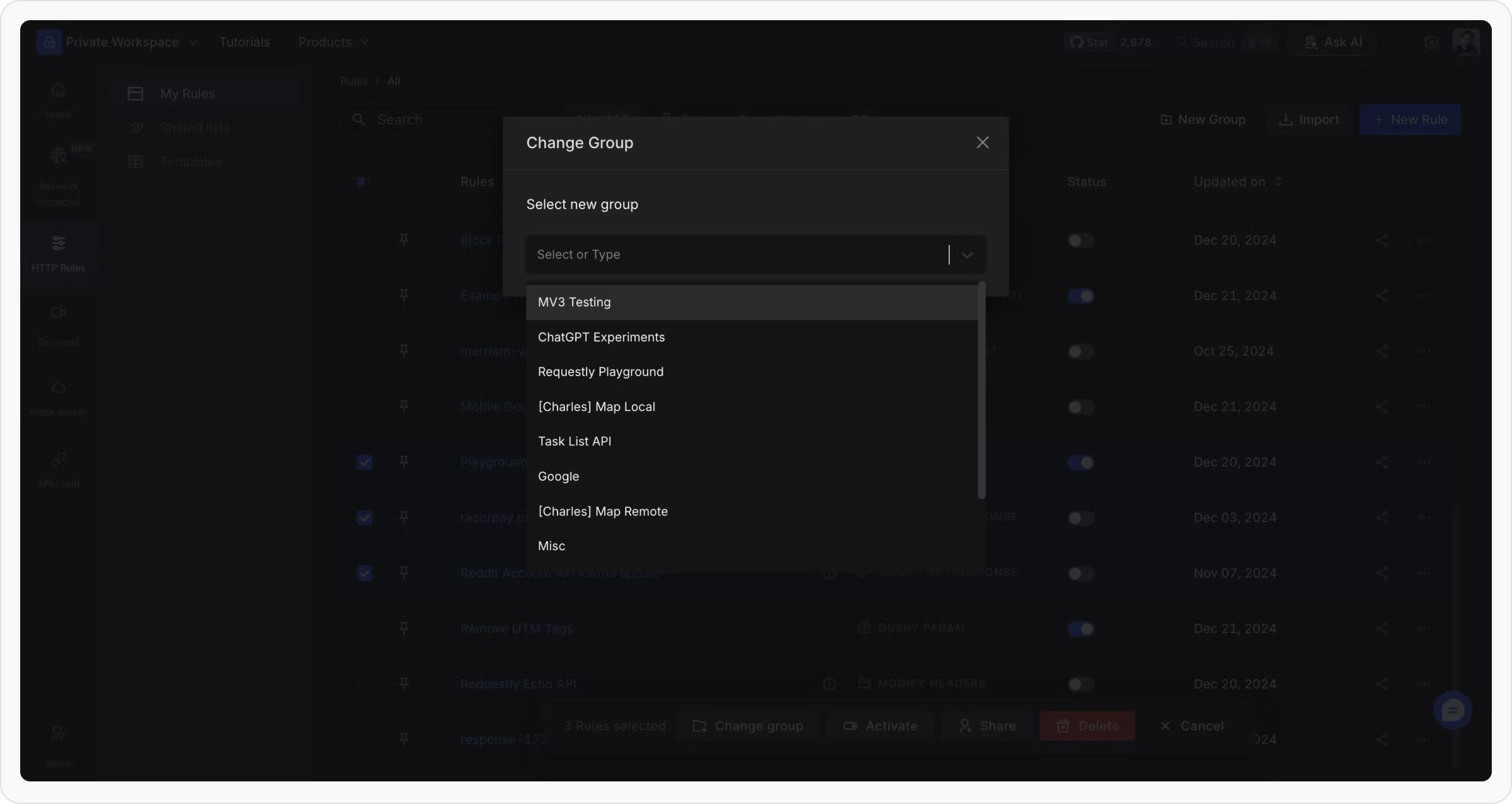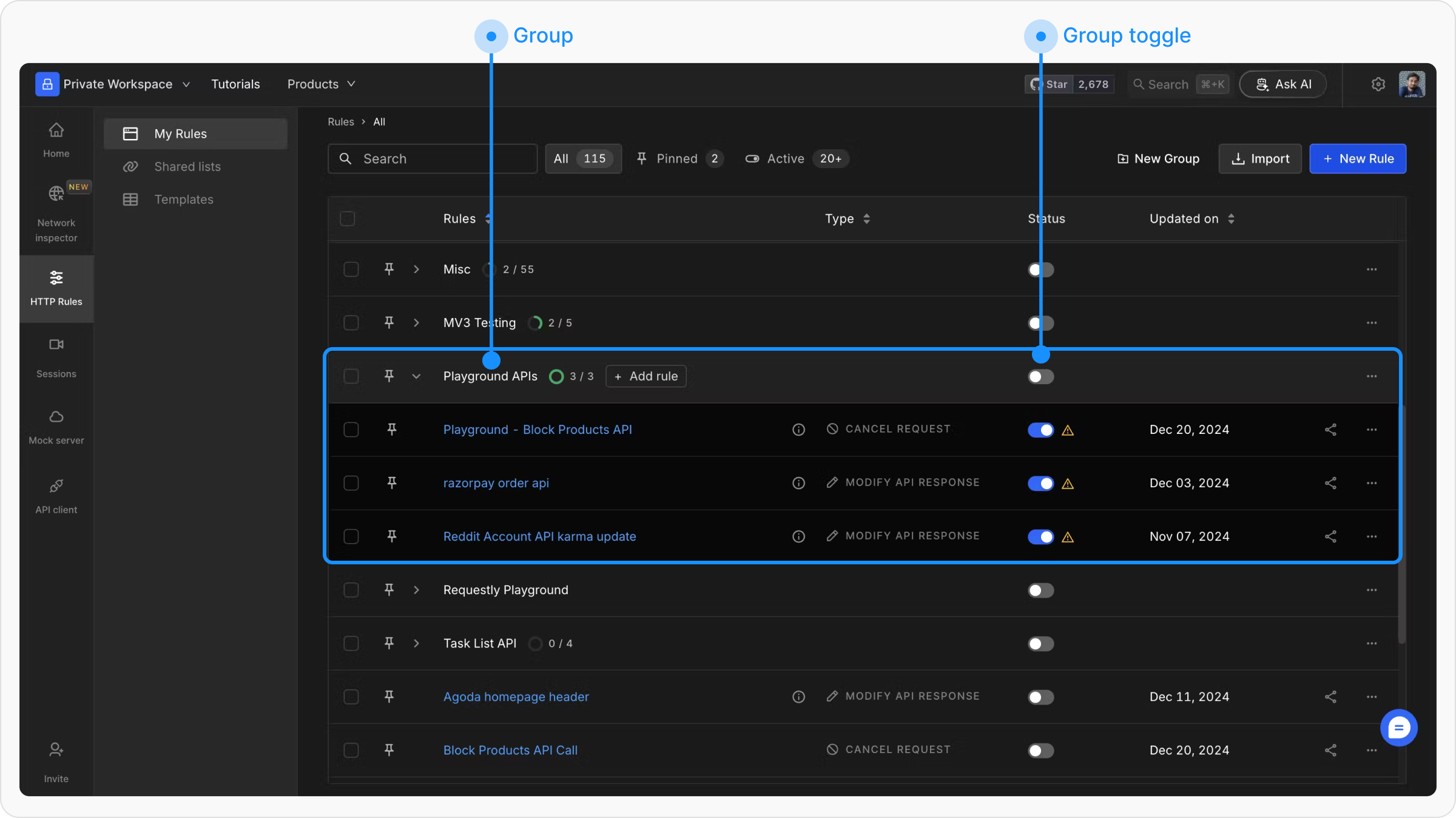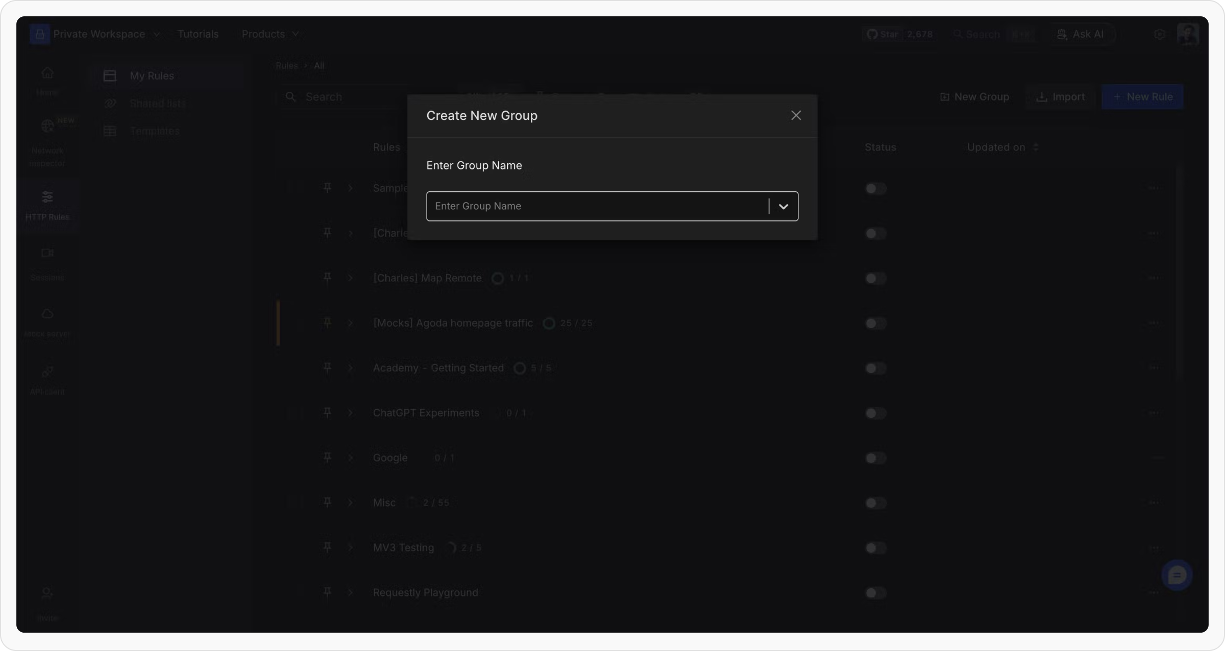 Requestly offers ten distinct types of rules that allow you to override default network request behaviors in a webpage. As the number of rules increases, managing them individually can become cumbersome. To address this, Requestly provides the ability to organize these rules into logical groups, enabling you to enable or disable them as a set.