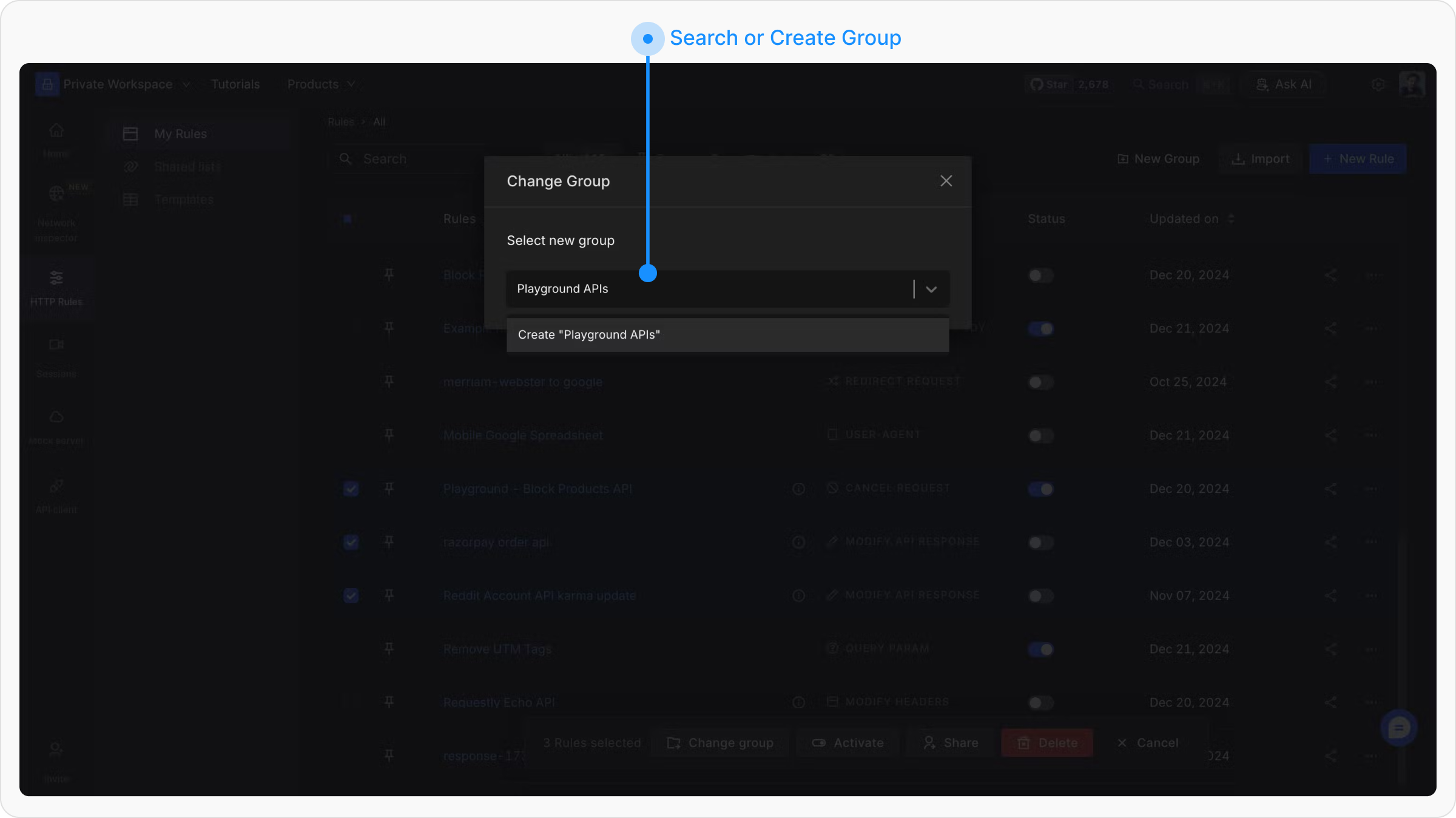 In the Group Modal, select an existing group or create a new one to organize the rules.