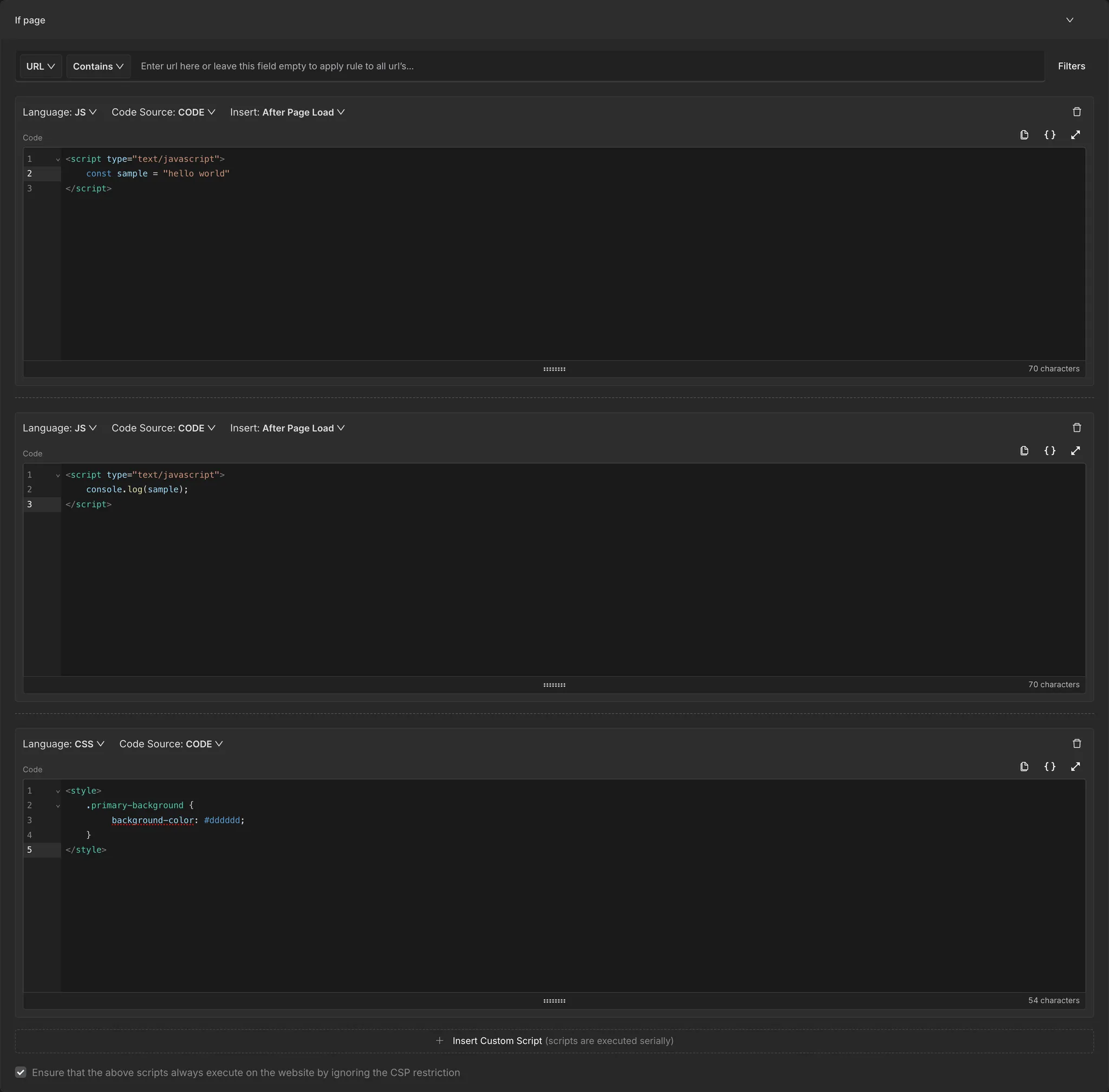 Insert Script rule allows you to insert multiple scripts and styles on a single page all the scripts are executed serially, You define a single condition, specifying the URL where the scripts should be injected. Multiple JavaScript and CSS files can be added to that page. Scripts and styles execute serially, in order, ensuring dependencies are handled correctly. How It Works- You define a single condition, specifying the URL where the scripts should be injected.