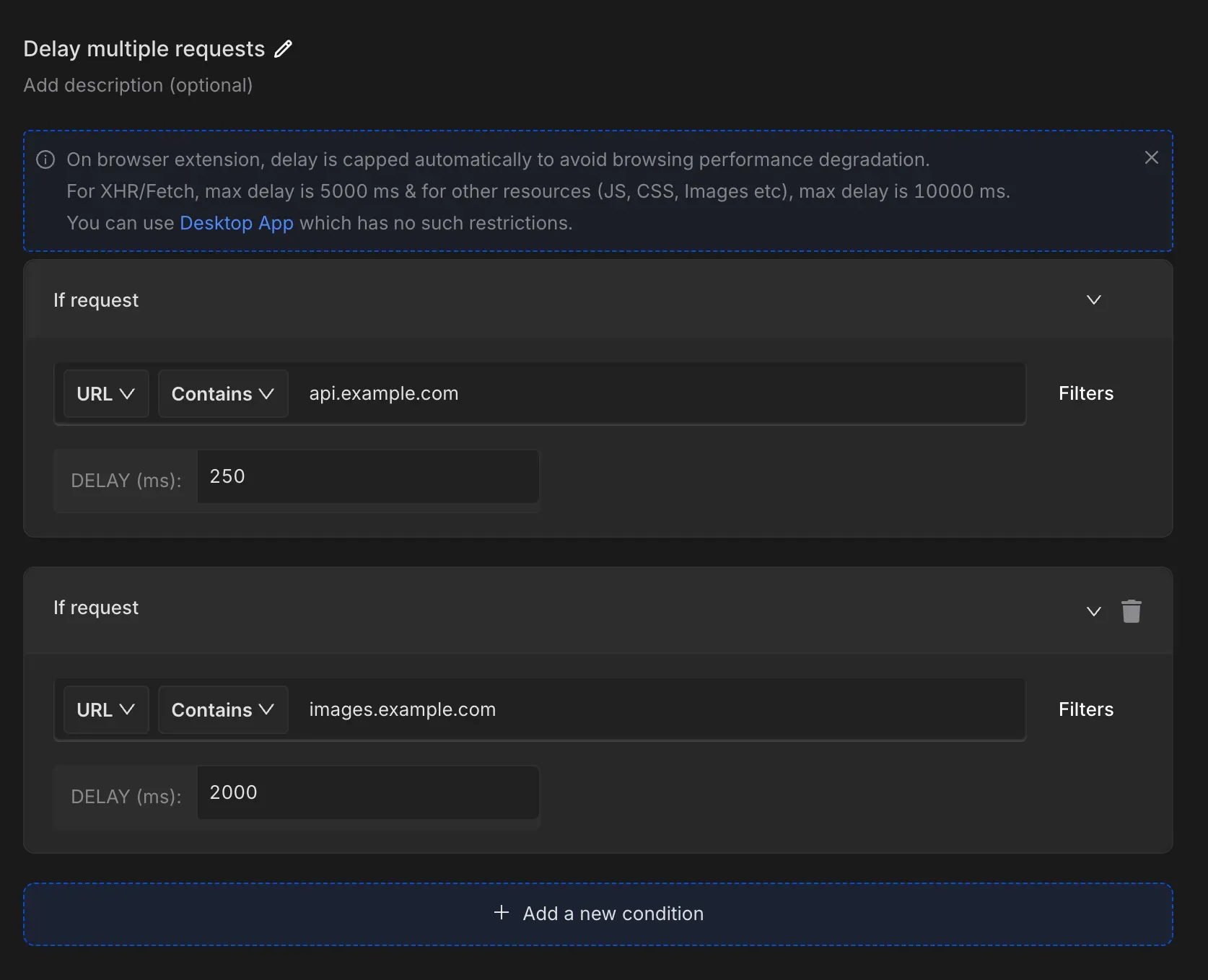 The Delay Network Request Rule in Requestly allows users to define multiple conditions within a single rule to artificially delay specific requests. This is useful for testing how applications behave under slow network conditions or simulating real-world latency issues.