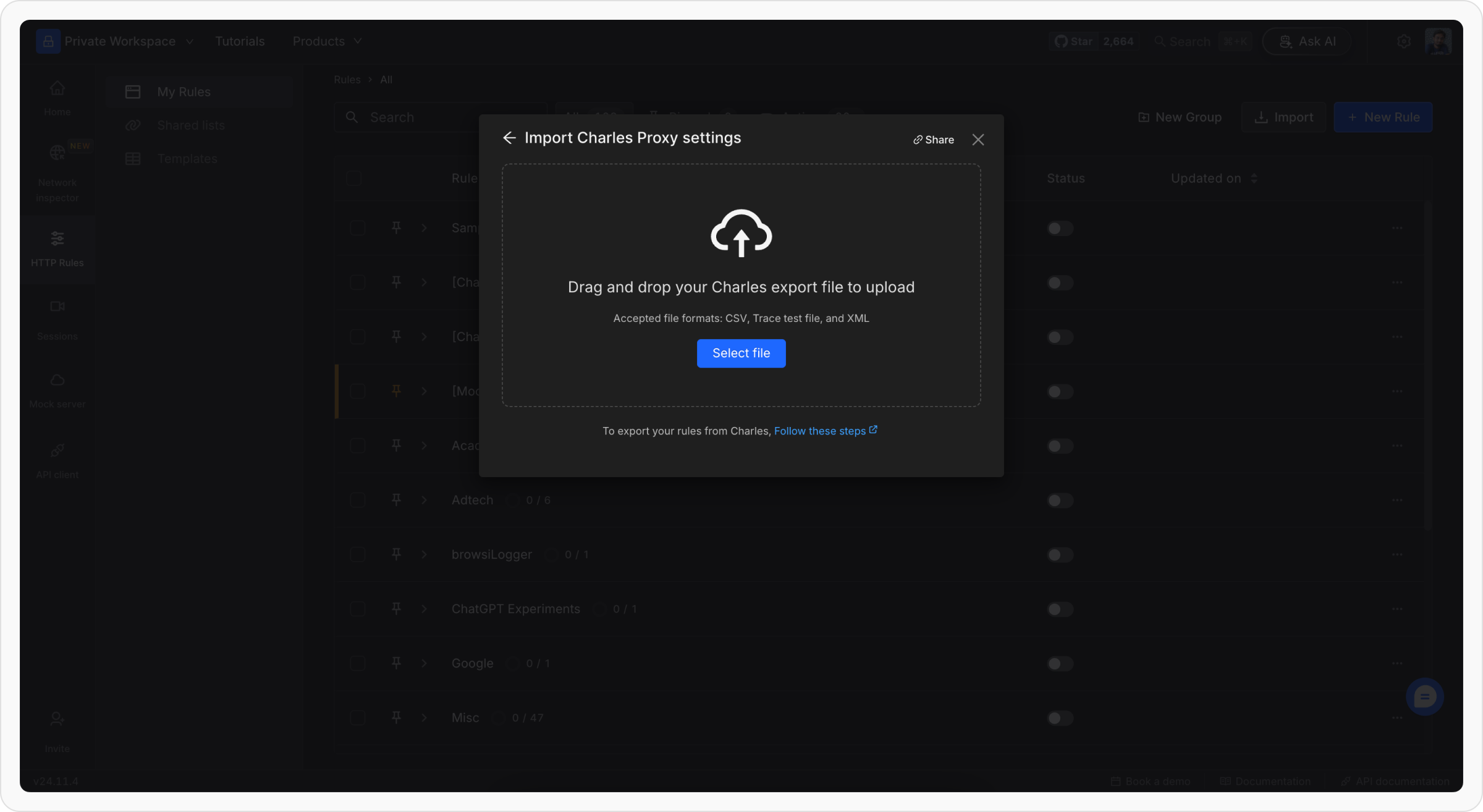 Charles Proxy is a popular debugging tool for monitoring and managing network traffic. Requestly can import configurations exported from Charles Proxy, enabling you to use your existing Charles Proxy rules and settings directly within Requestly. Step-by-step instructions are outlined below for exporting configurations from Charles Proxy and importing them into Requestly.