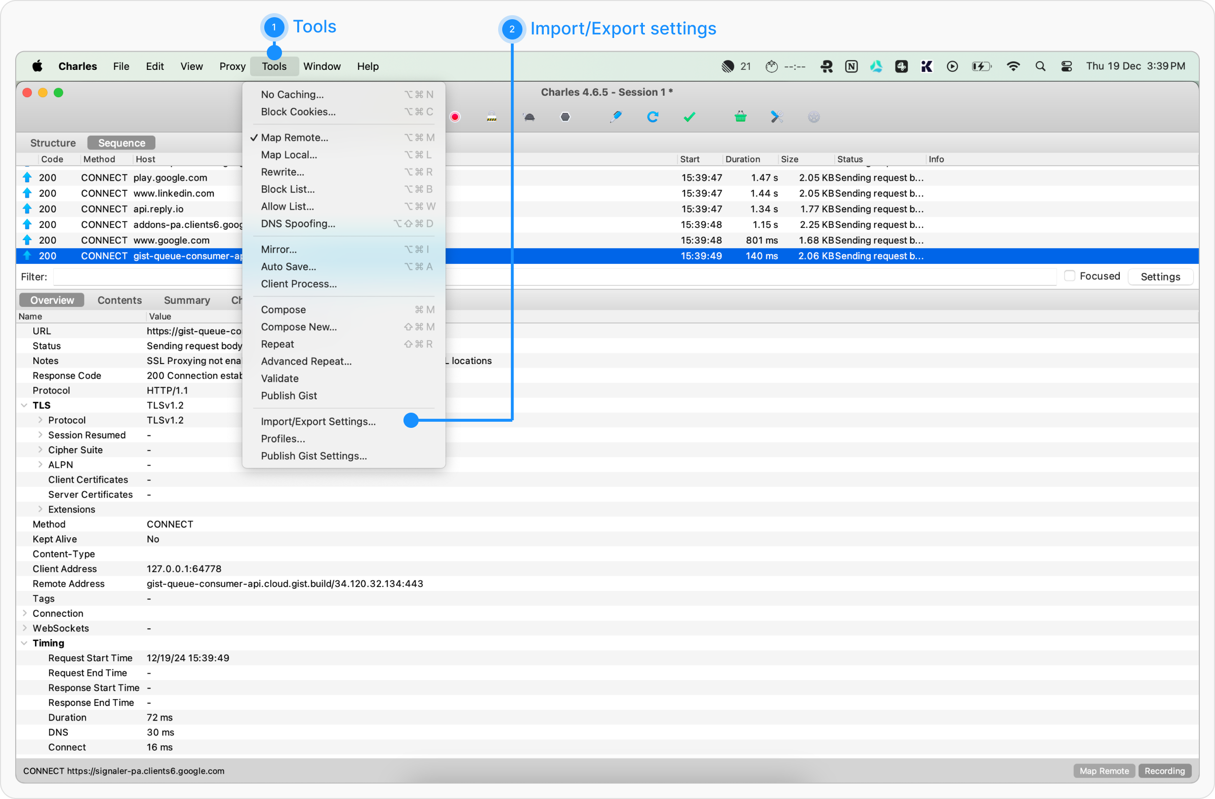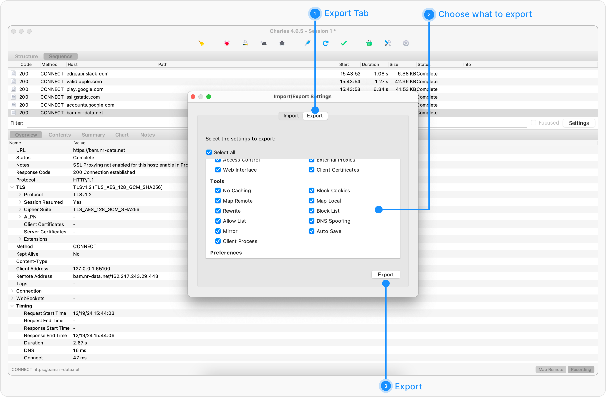 Follow the steps below to export your configurations from Charles Proxy:Step 1: Access Import/Export Settings