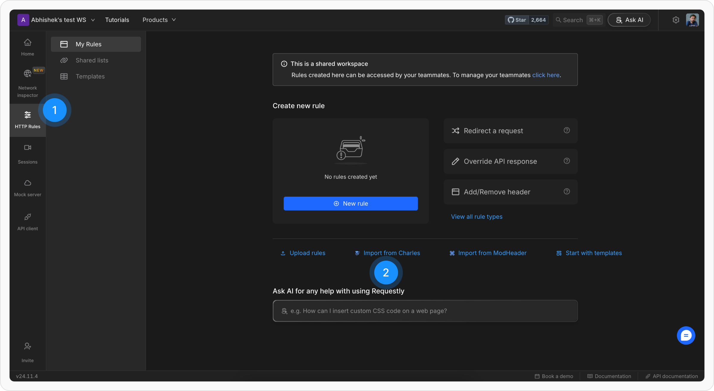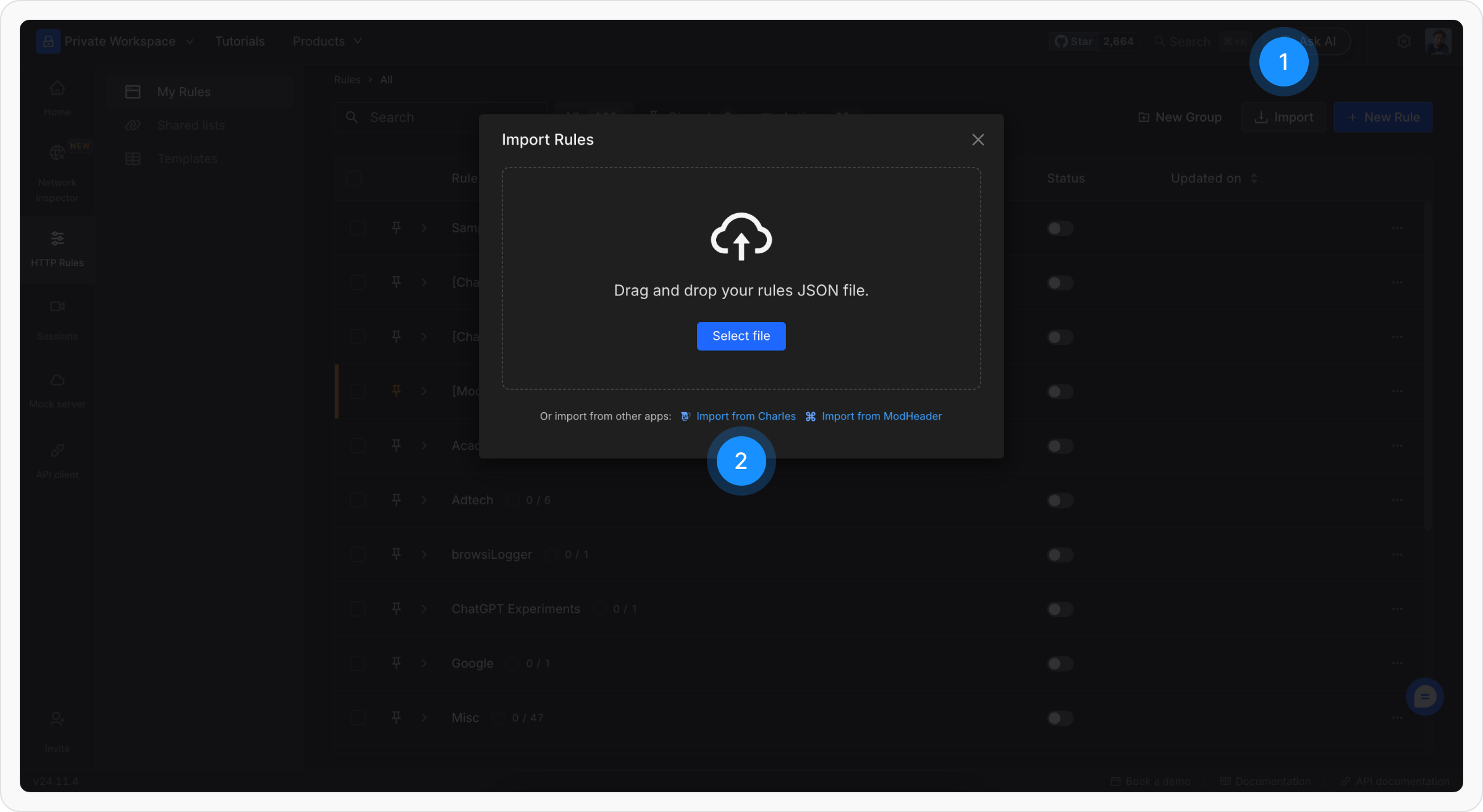 After exporting your configurations from Charles Proxy, follow these steps to import them into Requestly:Step 1: Open Import from Charles