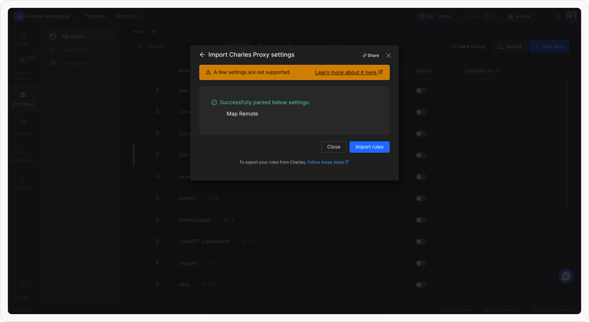 Requestly supports Rewrite, Map Local, Map Remote, No Caching, Block lists & Block Cookies configuration imports from Charles Proxy.