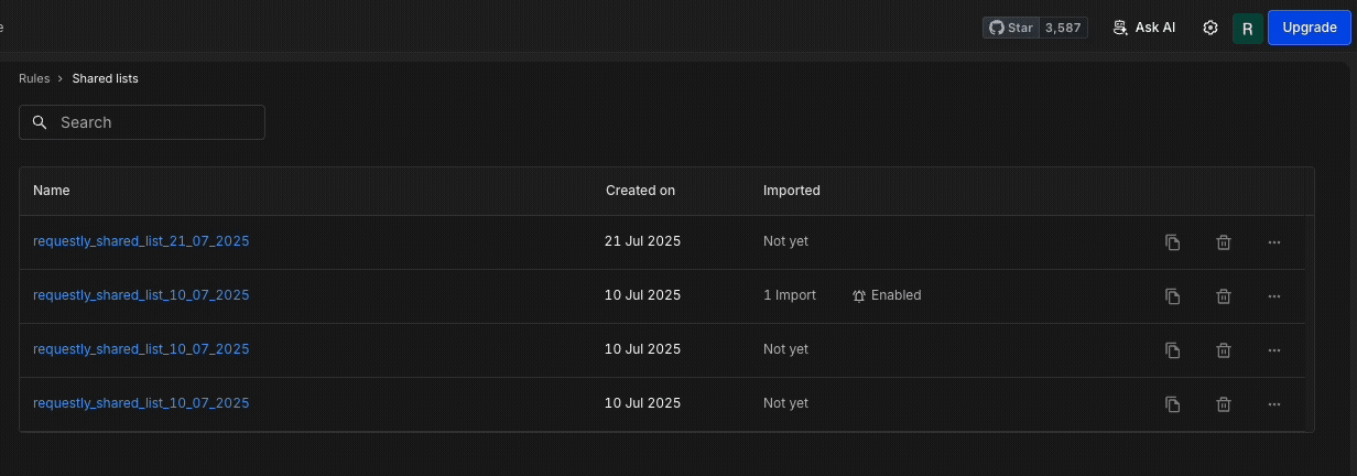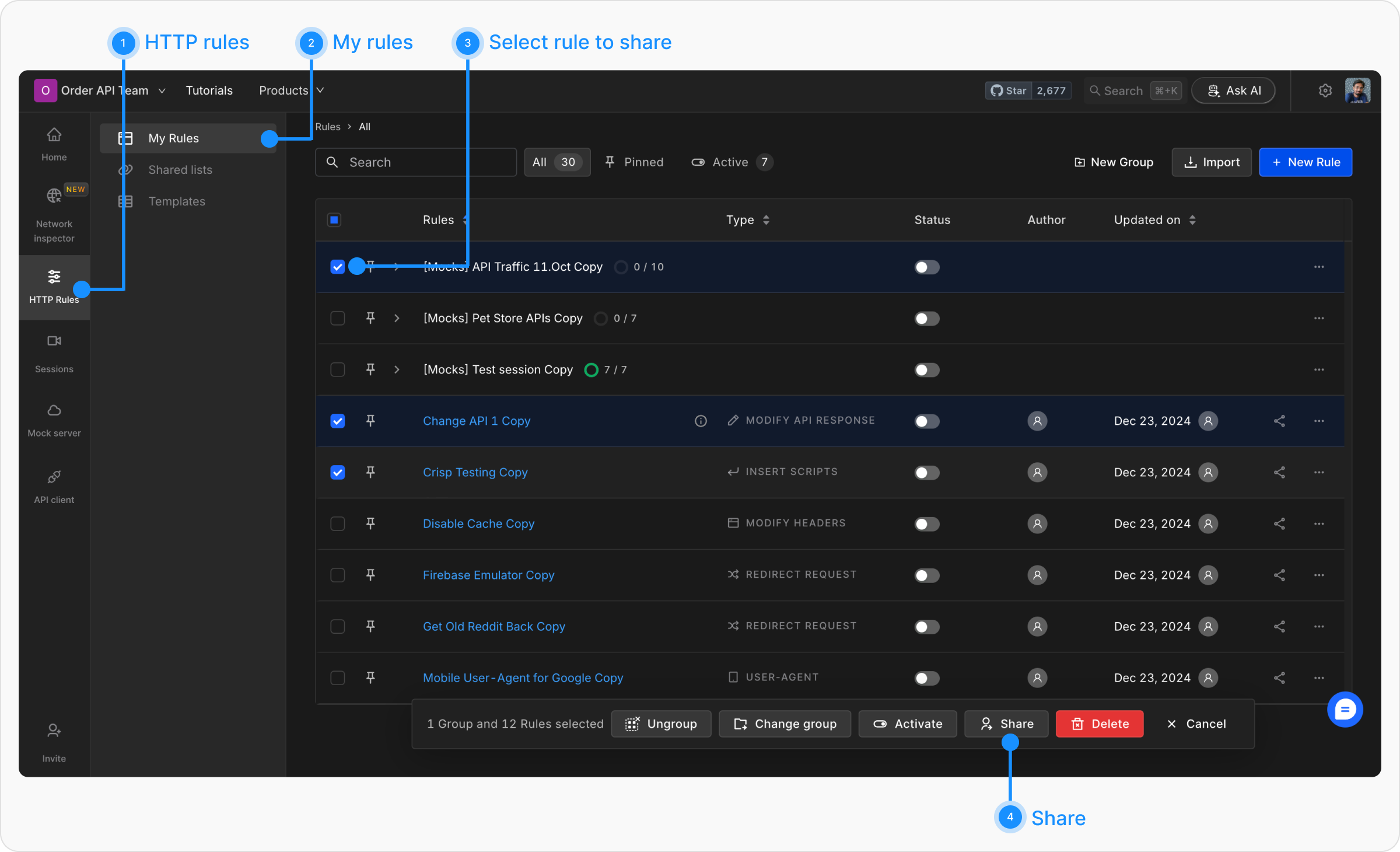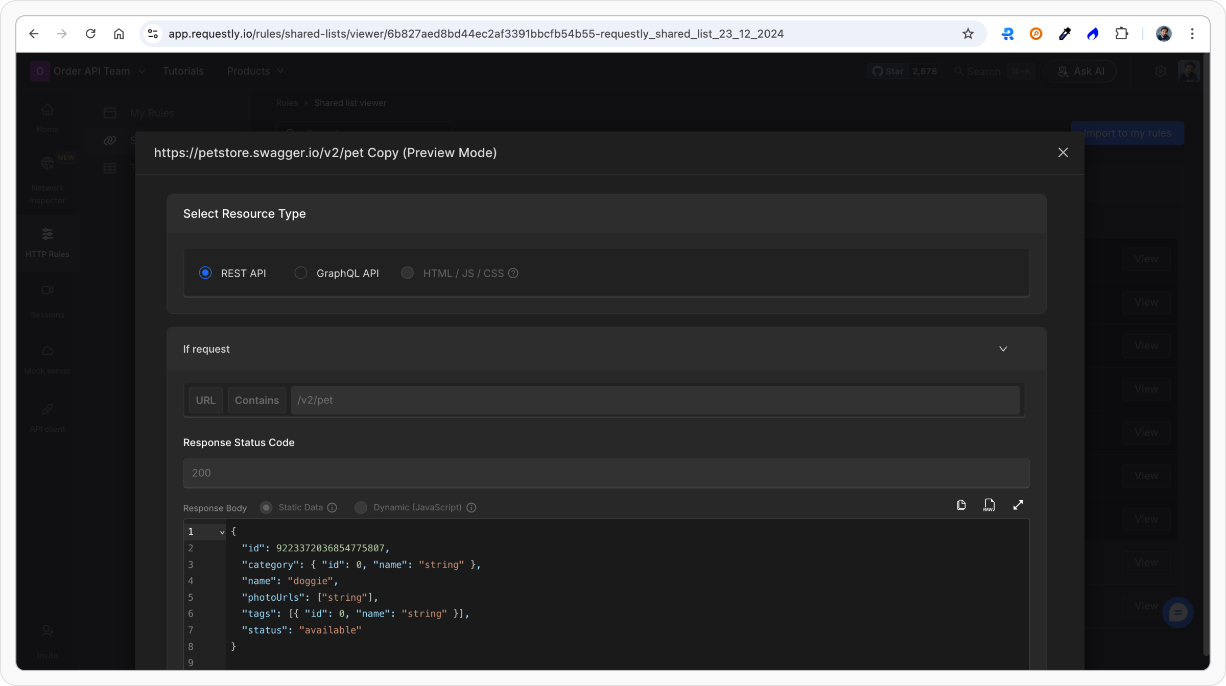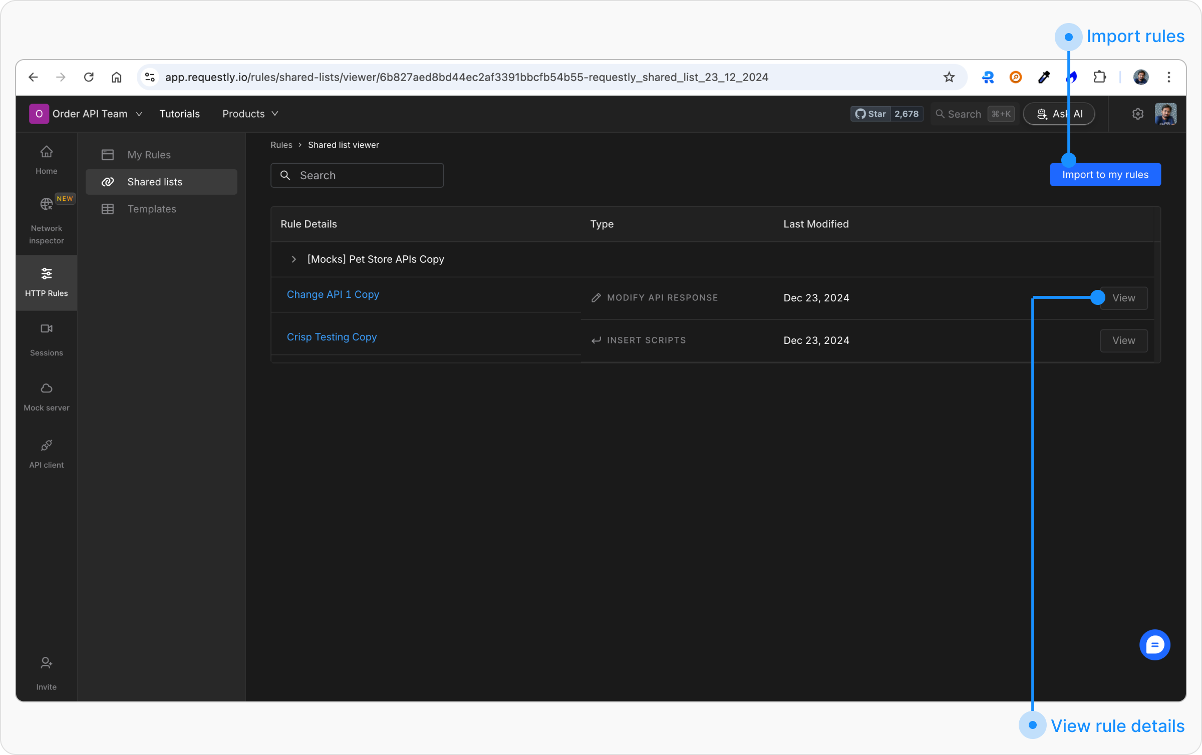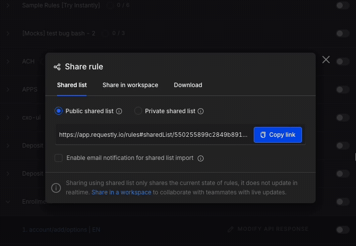 A Shared List is a convenient way to share HTTP rules using a single shareable link. You can create a Shared List for team collaboration or distribution while maintaining control over accessibility.