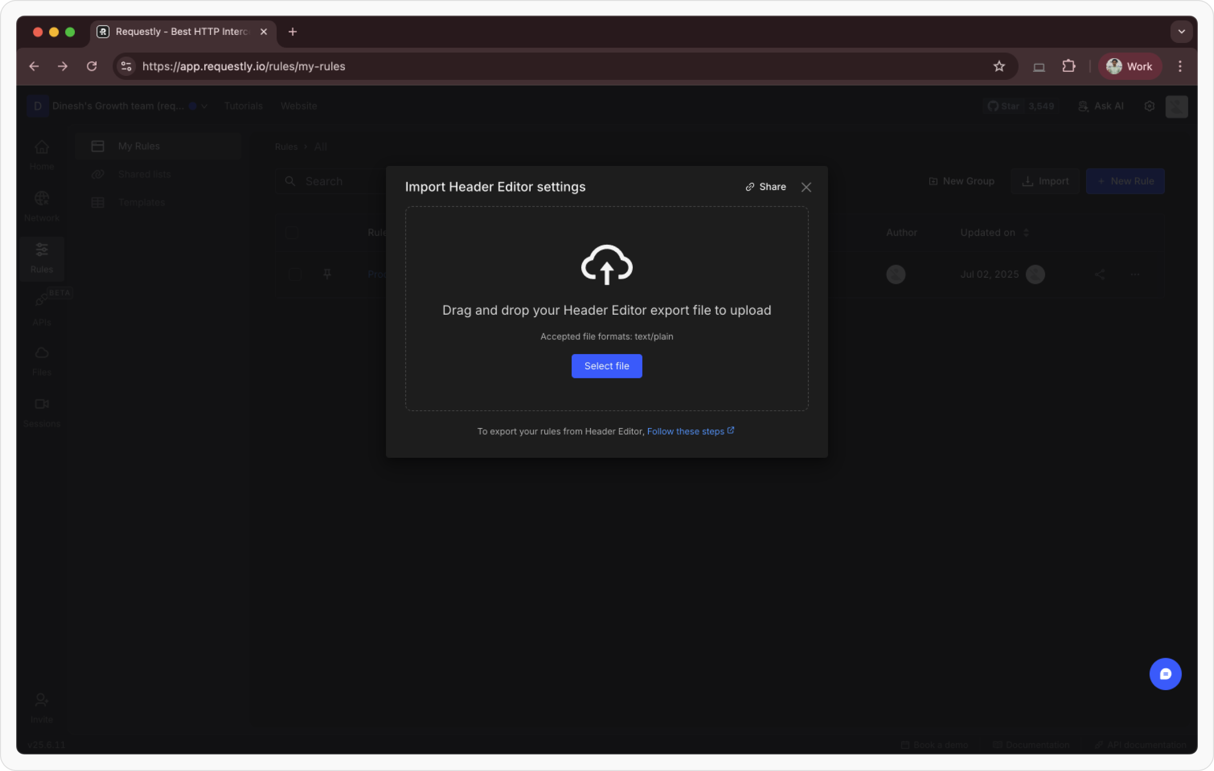 After exporting your configurations from Header Editor, follow these steps to import them into Requestly:1