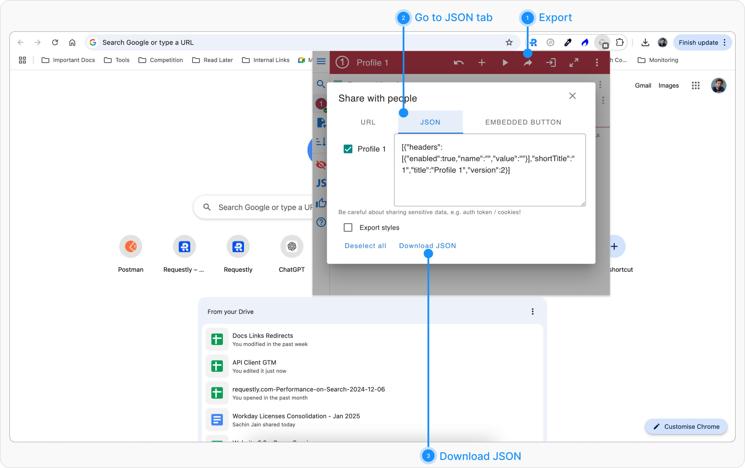 Click on the Export button located in the top bar and select Export JSON. Choose the profiles you want to export.Step 3: Download JSON File