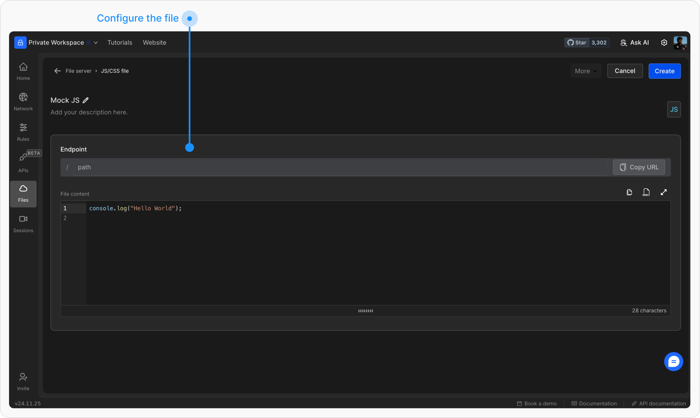 Click on "New file" to create a empty file or “Upload file” to upload a JS or CSS file directly.