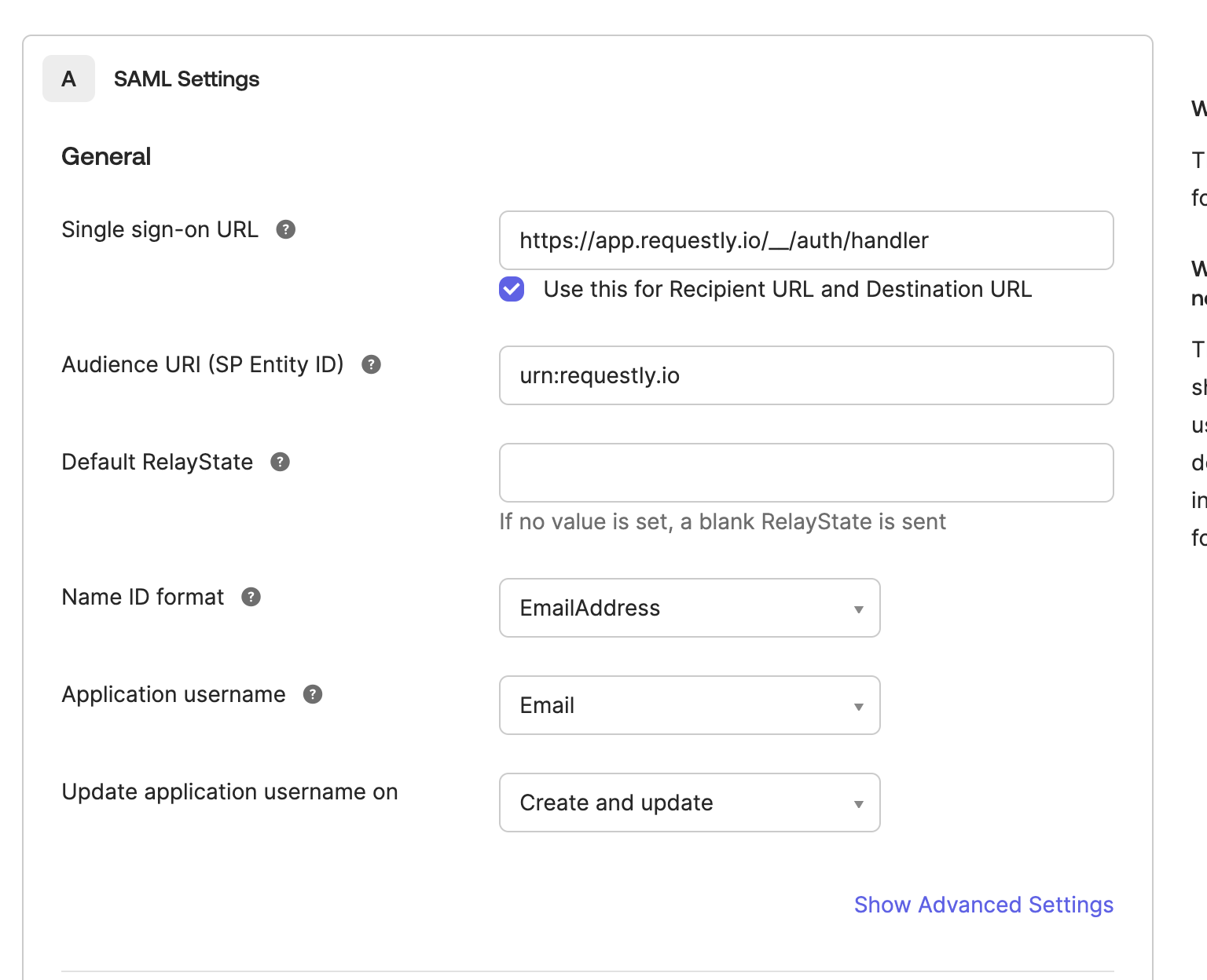 Audience URI (SP Entity ID) | urn:requestly.io |