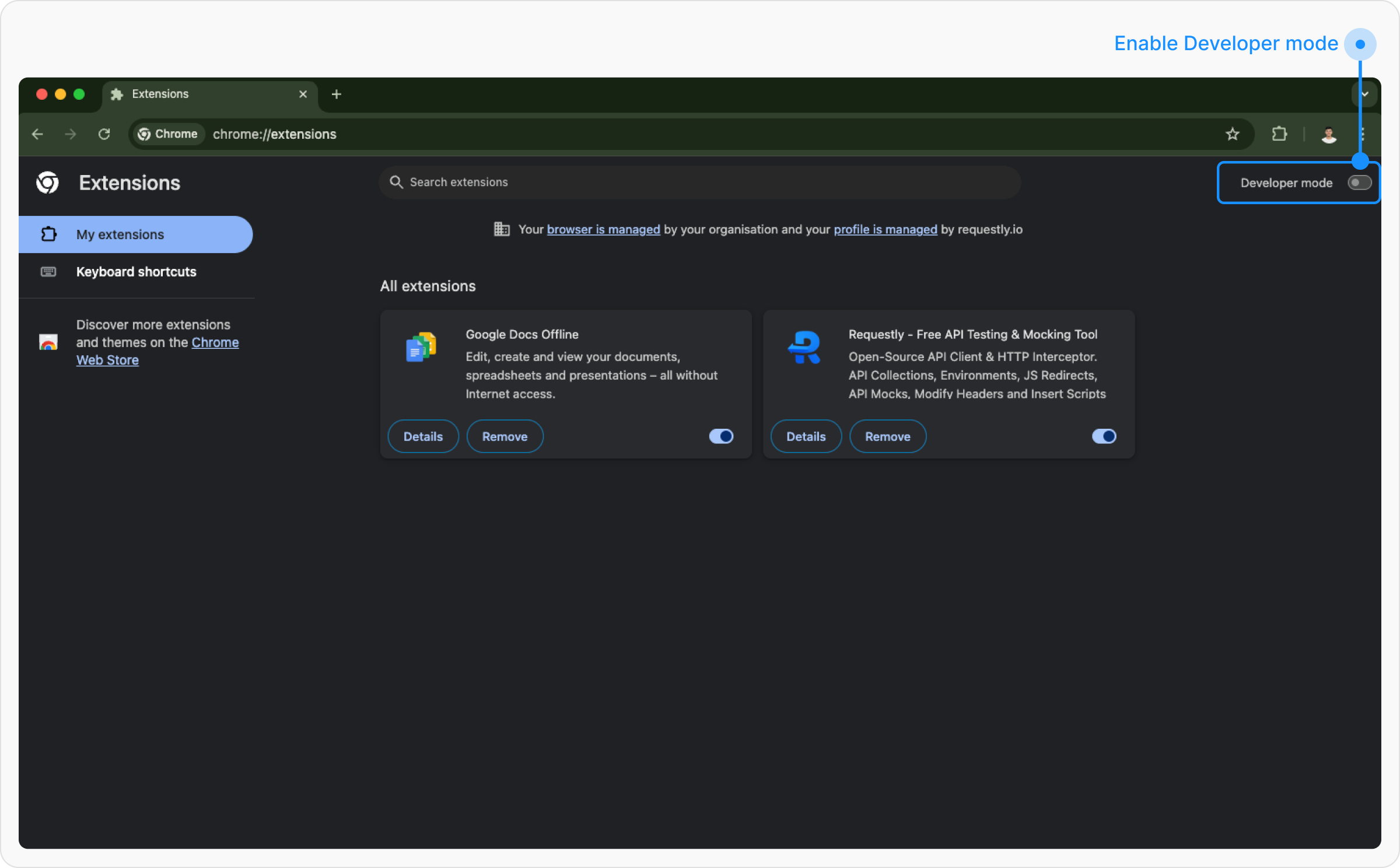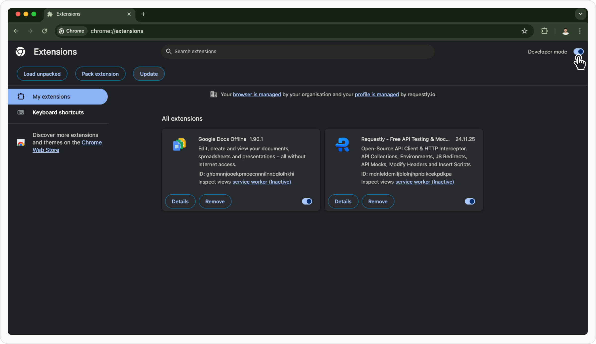 In the top-right corner of the Extensions page, toggle on Developer mode.